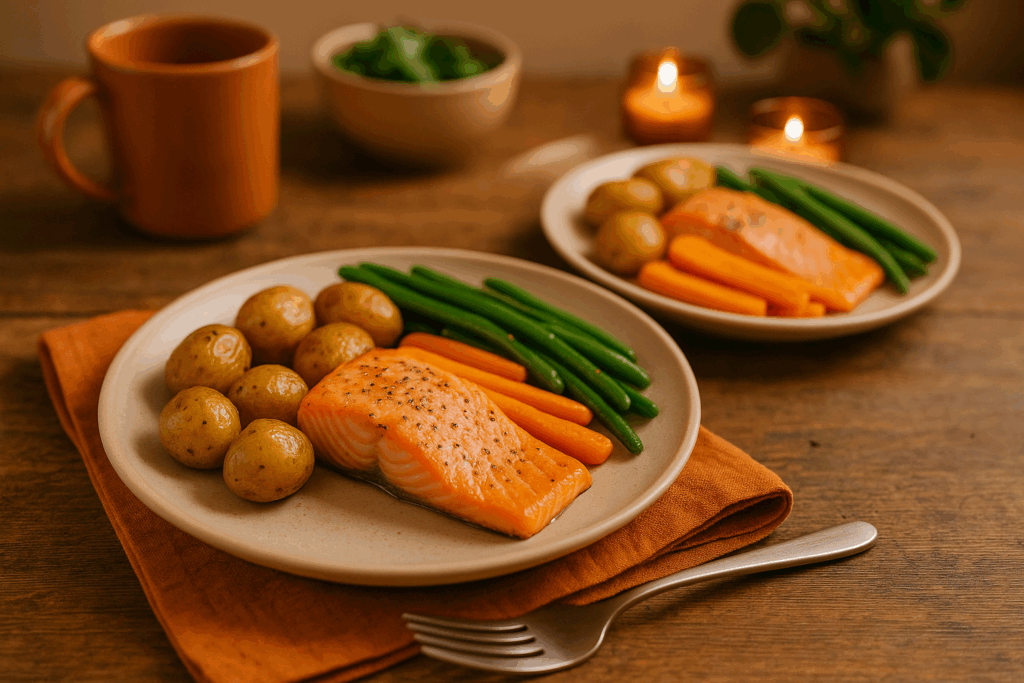 When dinner time comes knocking and you need something nutritious without the fuss, this oven-baked salmon with roasted veggies is your go-to. Juicy salmon fillets bake to flaky perfection alongside baby carrots, green beans, and golden mini potatoes — all seasoned with olive oil, garlic, and a pinch of paprika. The whole dish goes from fridge to table in 30 minutes, giving you back precious time without sacrificing taste or quality.